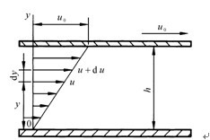 當(dāng)液體流動(dòng)時(shí),由于液體與固體壁面的附著力及流體本身的粘性使流體內(nèi)各處的速度大小不等,以流體沿如圖2-2所示的平行平板間的流動(dòng)情況為例,設(shè)上平板以速度u0向右運(yùn)動(dòng),下平板固定不動(dòng)。緊貼于上平板上的流體粘附于上平板上,其速度與上平板相同。緊貼于下平板上的流體粘附于下平板圖2-2液體的粘性示意圖上,其速度為零。中間流體的速度按線性分布。我們把這種流動(dòng)看成是許多無限薄的流體層在運(yùn)動(dòng),當(dāng)運(yùn)動(dòng)較快的流體層在運(yùn)動(dòng)較慢的流體層上滑過時(shí),兩層間由于粘性就產(chǎn)生內(nèi)摩擦力的作用。根據(jù)實(shí)際測定的數(shù)據(jù)所知,流體層間的內(nèi)摩擦力F與流體層的接觸面積A及流體層的相對流速du成正比,而與此二流體層間的距離dz成反比,即:F=μAdu/dz